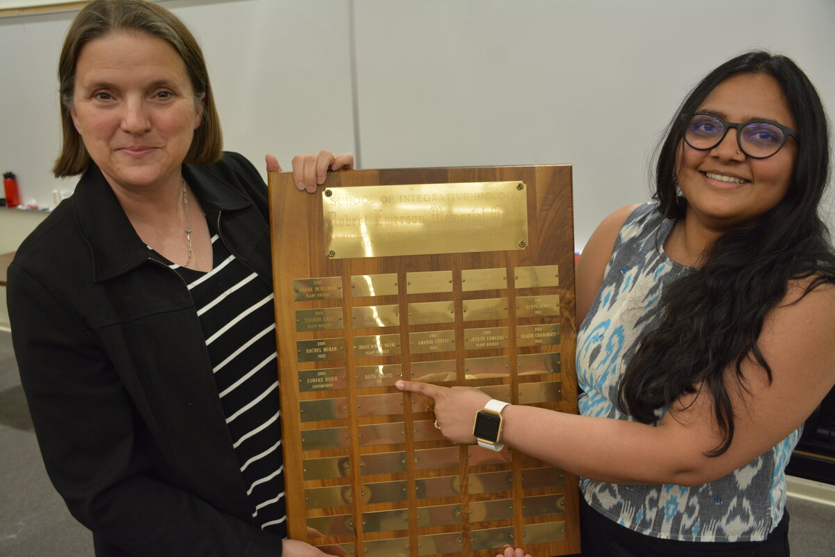 Becky Fuller and Ratna Karatgi posing with Emerson plaque